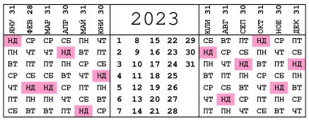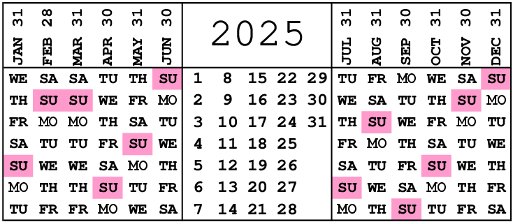 contain two calendar variants (5x2 and 2x5) with a table for the period 1916-2099. It indicates the Day of the Week for the Date 1st of the Month.