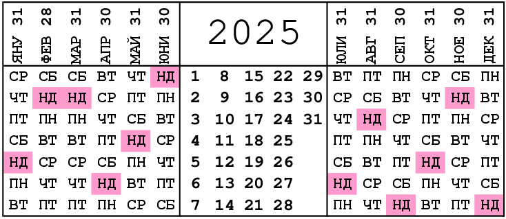 14 small calendars for 2025 on one page (English and Bulgarian variants)!