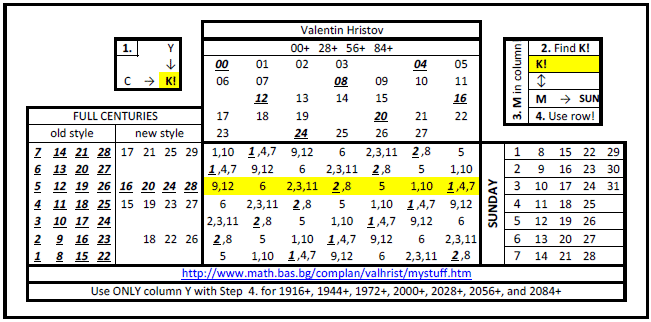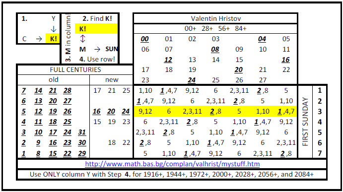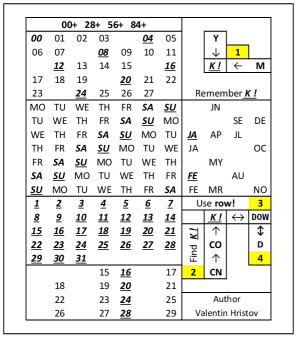 Second step is to find "First of Month Day of Week" at the crossing of the remembered Key Letter