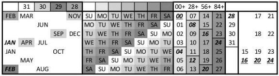 Find the Day of Week of the First Date of the Month using the table on the outer cylinder or cone (leap components are BOLD ITALIC RED).