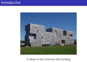 Творческата работа по изследователските проекти трае на практика между 4 и 5 седмици. Тя се предшества от една седмица учебни занятия – сутрешни лекции, компютърни занимания, вечерни лекции и работа по мини-проект. Тази година темата на мини-проекта бе да се изследва от научна гледна точка ахитектурен обект от кампуса на MIT. При представянето му учениците показват не само познанията си на обстановката, но и доколко са овладели компютърната система на MIT и езика LaTex. Ето например елементи от мини-презентацията на Иван Иванов, който изследва вентилацията на общежитието Simmons Hall”.