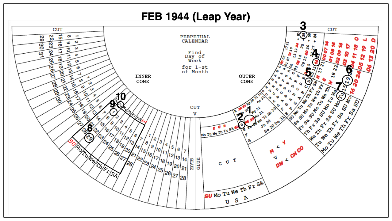 Find the Day of Week of the First Date of the Month using the table on the outer cylinder or cone (leap components are BOLD ITALIC RED).