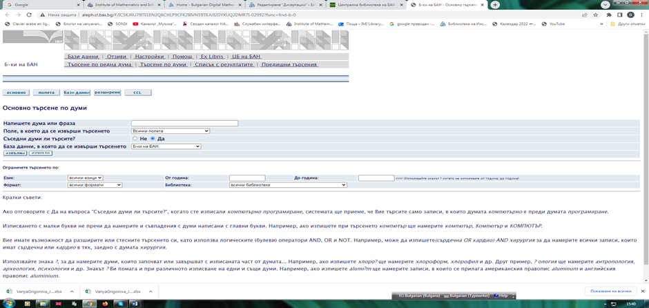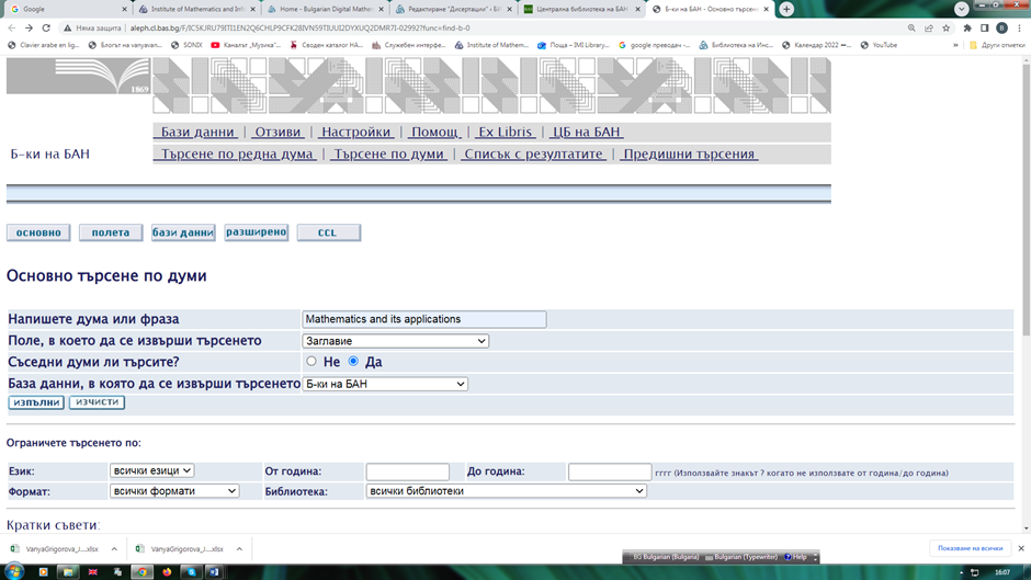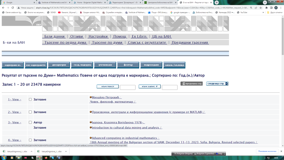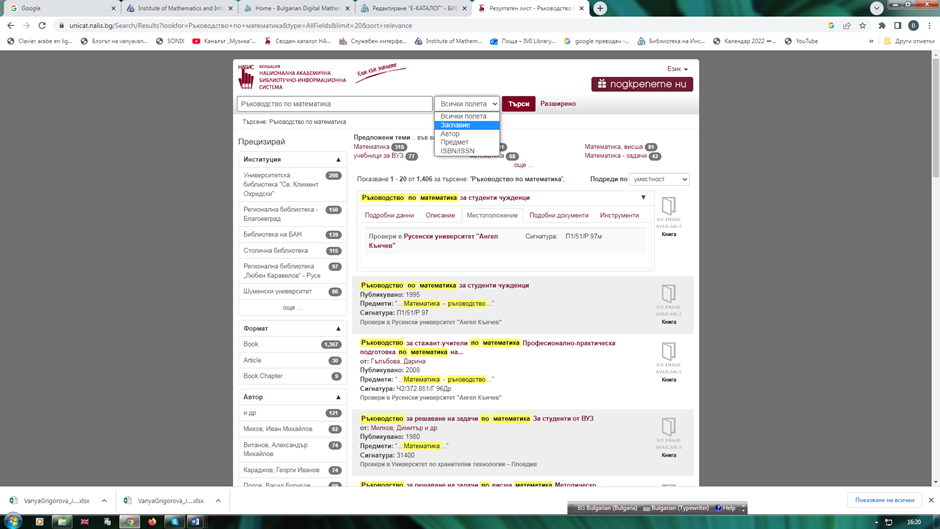 След кликване върху линка се задава поле за търсене на желаните от Вас: заглавие, автор или по друг критерий. Ако ресурсът е наличен, се появява списък с библиографски записи. Можете да отсявате резултатите, като направите избор в лявата вертикална лента: институция, формат (книга, списание и др.), език, автор, година и т. н.