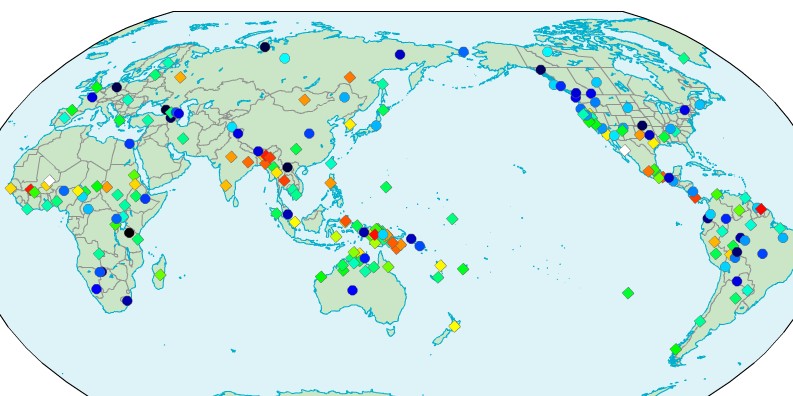 On the map the 130 blandest languages are marked by diamonds and the 70 weirdest ones by circles, with the colours progressing from white (the two blandest ones) to red-orange-yellow-green-cyan-blue-black (the weirdest one).