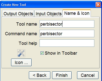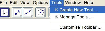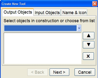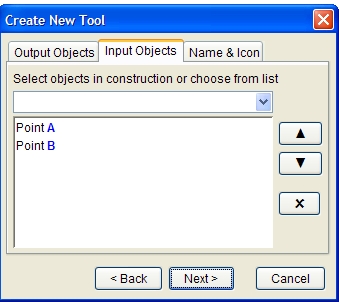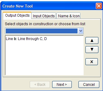 In the dialog window Create New Tool select the objects in the construction that you want to be displayed. In our case this is the perpendicular bisector – the line b. After selecting all required objects, click on the Next> button. The input objects required for the construction appear.
