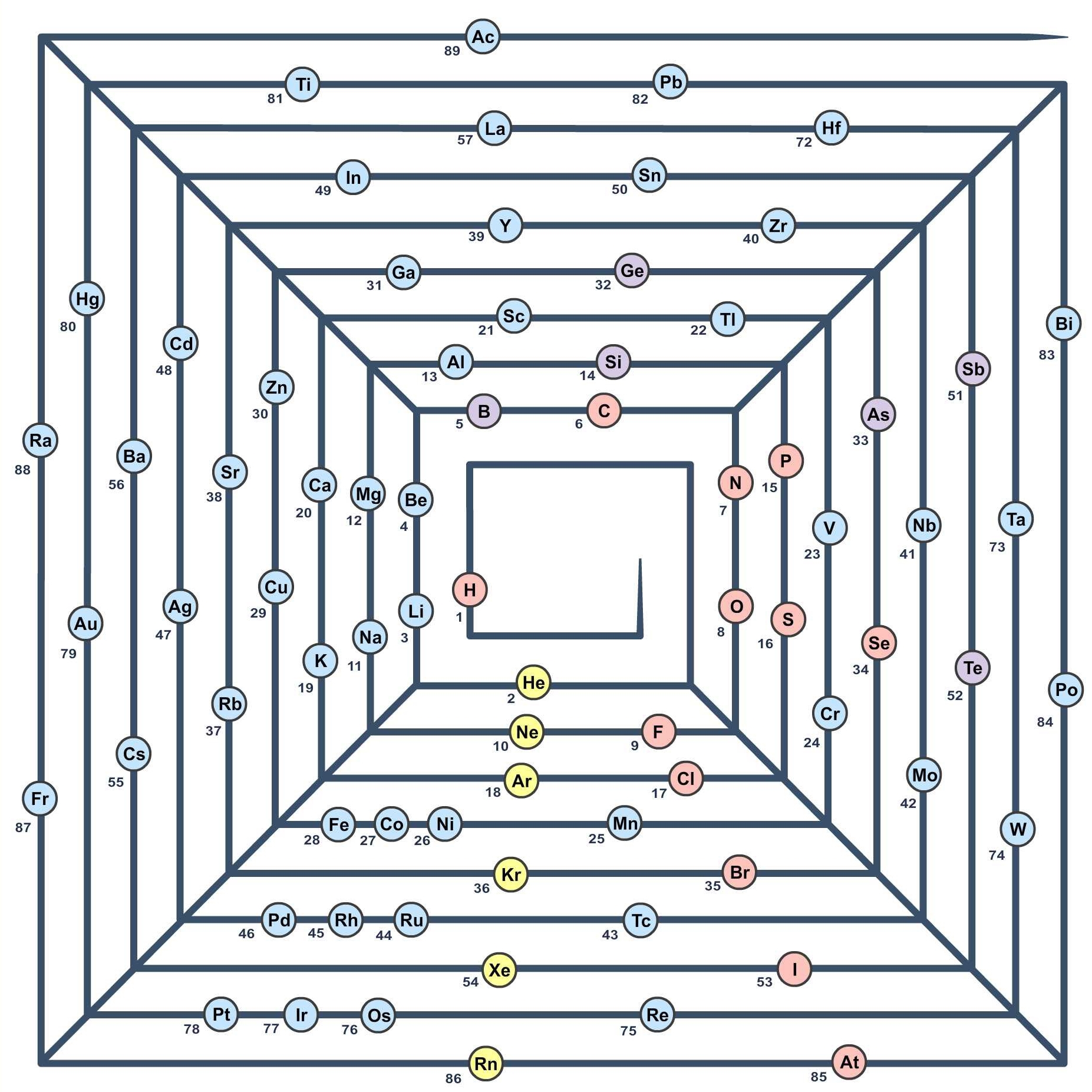 Connect the chemical symbols of other two elements from group three with a green intercept. How are the chemical symbols of the elements of group IIIA located on the spiral?