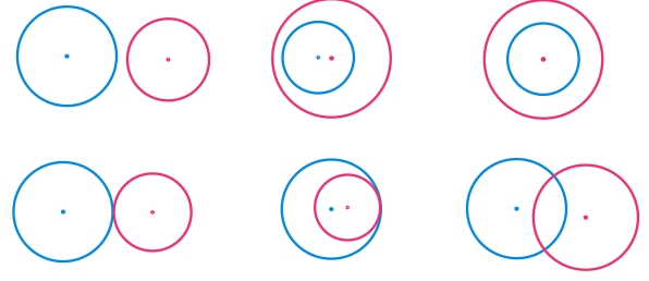 Задача 2. Намерете условия за взаимното положение на две окръжности в зависимост от радиусите им и разстоянието между центровете им. Ако d е разстоянието между центровете, r и R са радиусите на две окръжности, запишете в тетрадката си получените зависимости.