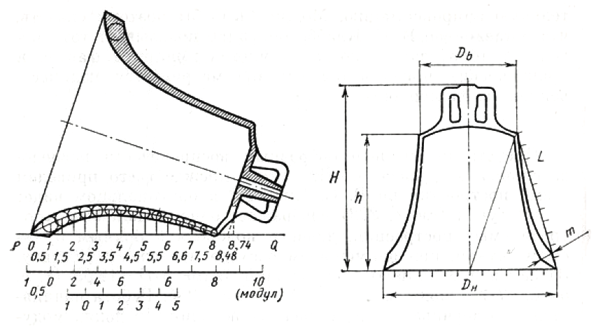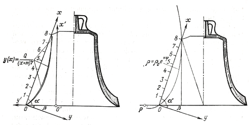 Схеми на построение на стената на камбана по метода на Кнаббе Следващата стъпка е да "завъртим" схемата в нова координатна система, където центърът на системата е в точка О (първа точка от правата PQ, разделена на модули) и абцисата да е основата на камбаната. От което следва, че ъгълът на завъртане е β=900–α където α е ъгълът в основата на профила. Преобразуванието на новите точки от правата PQ в новопостроената координатна система може да изразим така: (X_i^',y_i ) (i=1,2,…,8) и (x_i,y_i ) (i=1,2,…,8) x_i^' (x_i-x_o )cosβ-( y_i-y_o)sinβ, y_i^'=-(x_i-x_o )sinβ-(y_i-y_o )cosβ. От така построените криви се наблюдава, че кривите могат да се изразят със степенна функция y(x)=b/((x+m)^n ) , която е позната в музикалната акустика като „музикално-целесъобразна горна форма (рупор)“ или чрез логаритмична спирала изразена в полярна координатна система с уравнение от вида ρ=ρ_o q^(φ/2π) , където ρо е полярен радиус на някоя точка в качеството на начало и коефициент на ръста на спиралата – q. Логаритмичната спирала може да се изрази чрез ρ=ρ_o e^kφ , където k е параметър изразен чрез коефициента на ръста – съотношението: k=lng/2π . Така изразените криви са представени на фигура 2.