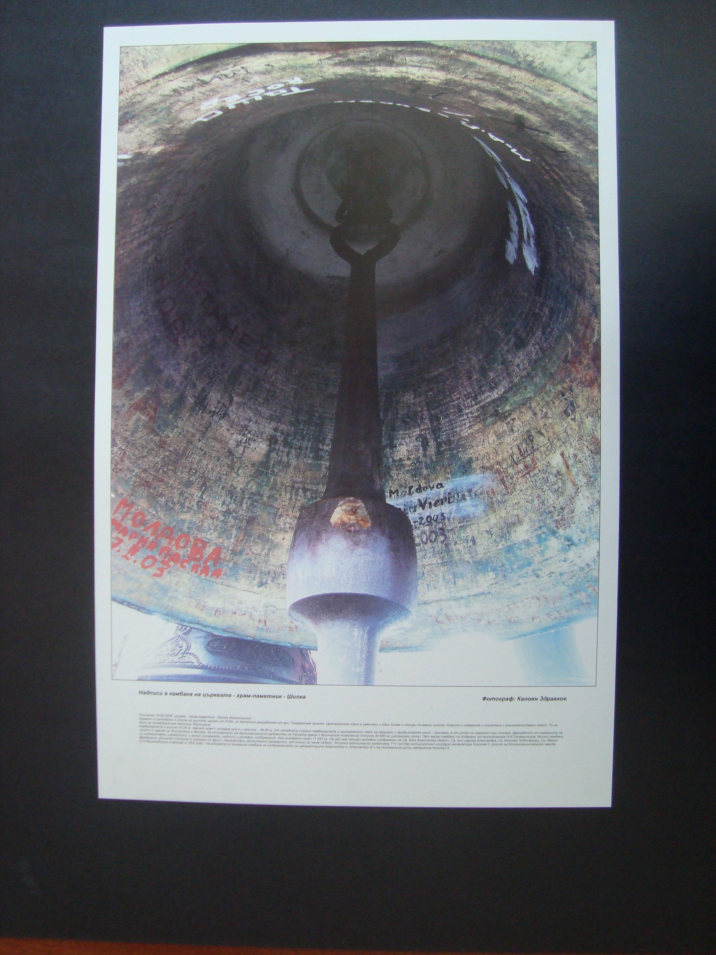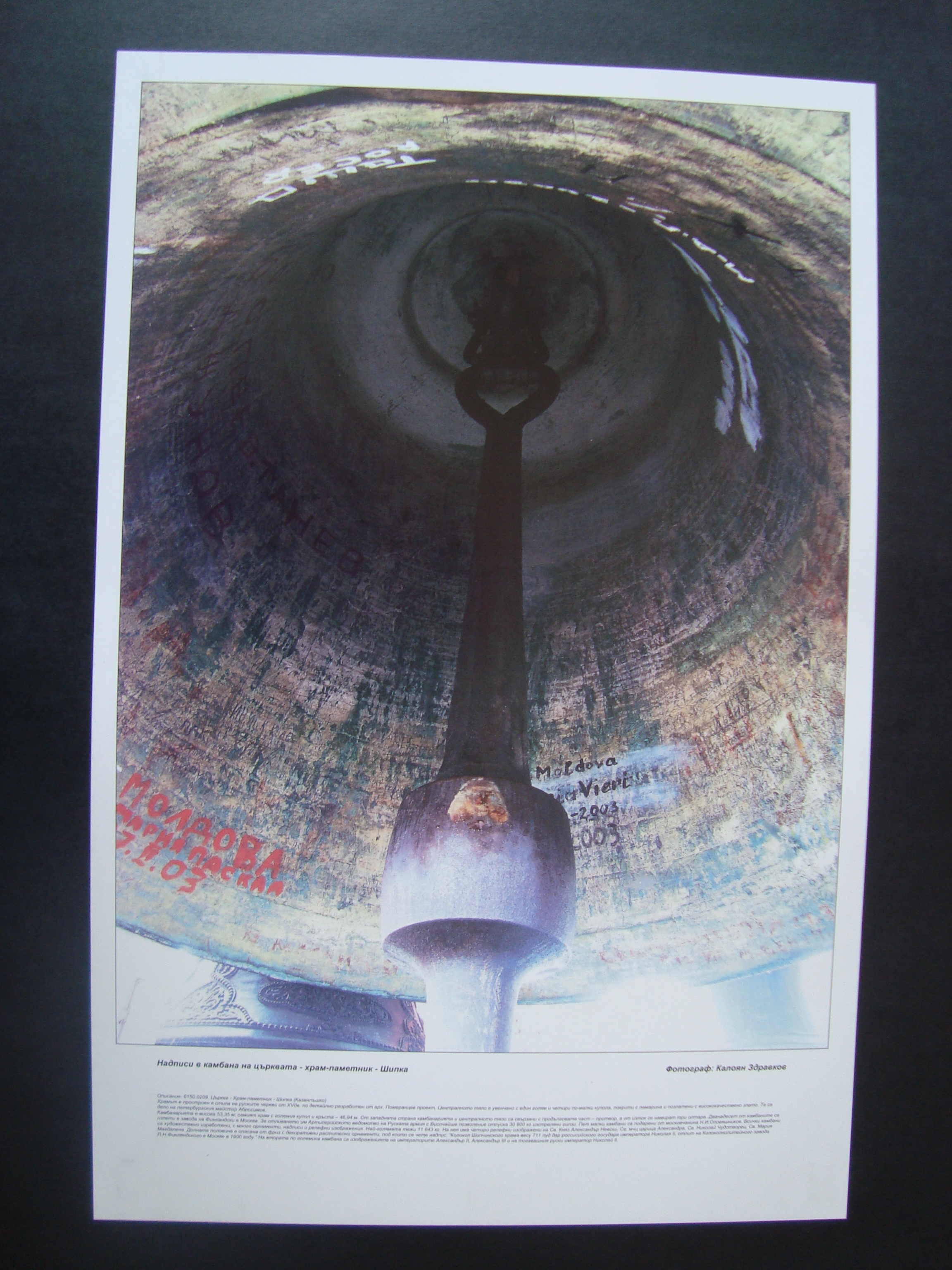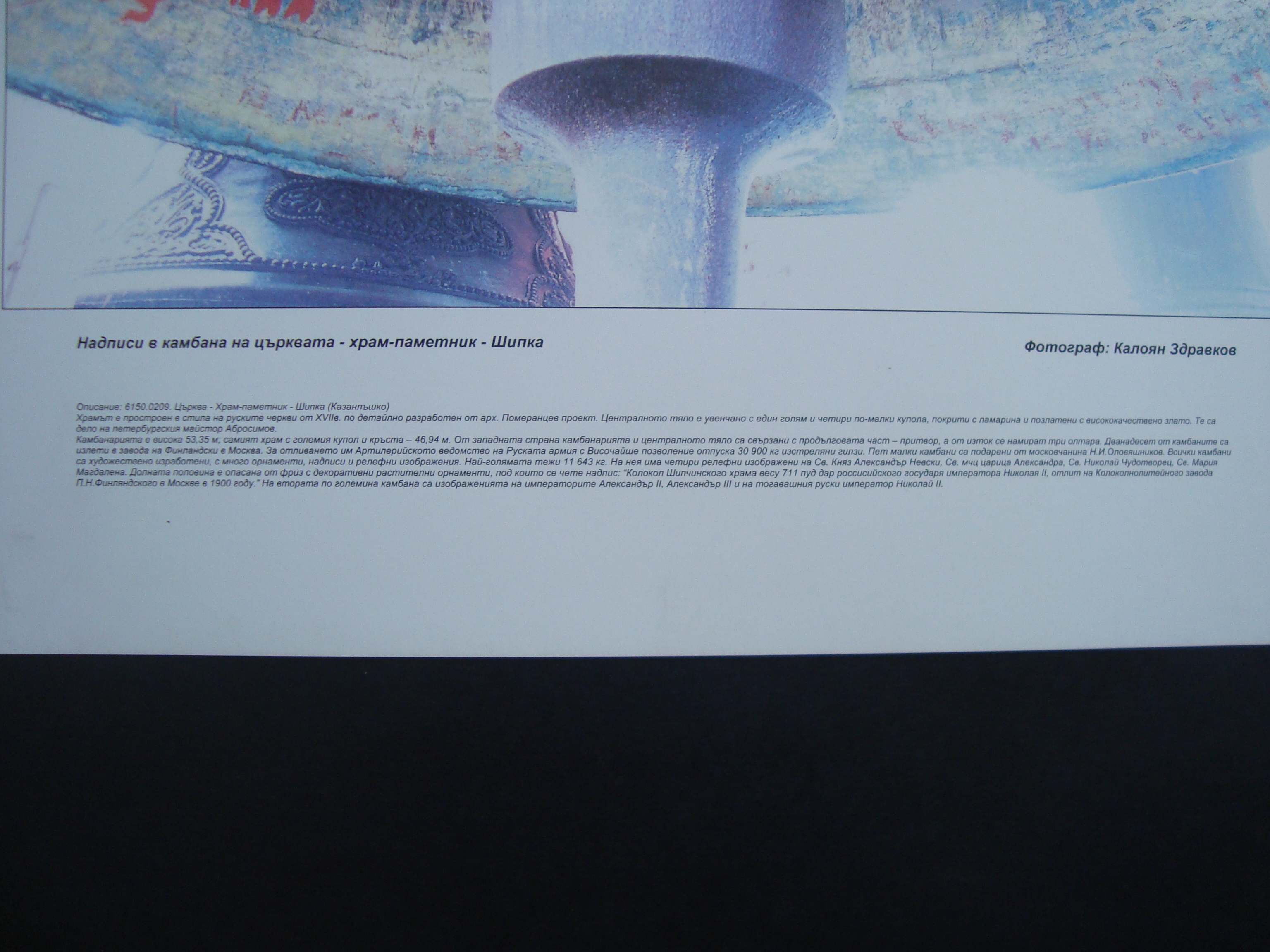 6150.0209. Църква - Храм-паметник - Шипка (Казанлъшко) Храмът е простроен в стила на руските черкви от ХVІІв. по детайлно разработен от арх. Померанцев проект. Централното тяло е увенчано с един голям и четири по-малки купола, покрити с ламарина и позлатени с висококачествено злато. Те са дело на петербургския майстор Абросимов. Камбанарията е висока 53,35 м; самият храм с големия купол и кръста – 46,94 м. От западната страна камбанарията и централното тяло са свързани с продълговата част – притвор, а от изток се намират три олтара. Дванадесет от камбаните са излети в завода на Финландски в Москва. За отливането им Артилерийското ведомство на Руската армия с Височайше позволение отпуска 30 900 кг изстреляни гилзи. Пет малки камбани са подарени от московчанина Н.И.Оловяшников. Всички камбани са художествено изработени, с много орнаменти, надписи и релефни изображения. Най-голямата тежи 11 643 кг. На нея има четири релефни изображени на Св. Княз Александър Невски, Св. мчц царица Александра, Св. Николай Чудотворец, Св. Мария Магдалена. Долната половина е опасана от фриз с декоративни растителни орнаменти, под които се чете надпис: “Колокол Шипчинского храма весу 711 пуд дар россисийского государя императора Николая ІІ, отлит на Колоколнолитейного завода П.Н.Финляндского в Москве в 1900 году.” На втората по големина камбана са изображенията на императорите Александър ІІ, Александър ІІІ и на тогавашния руски император Николай ІІ. |