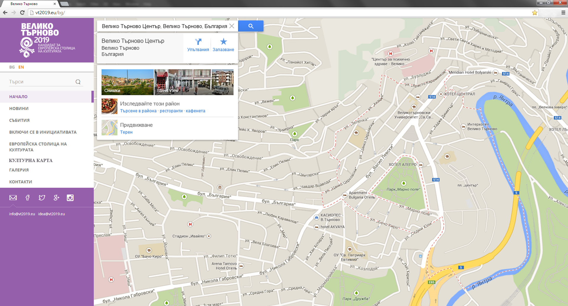 28 май 2014 г., Офис на Велико Търново - кандидат за Европейска столица на културата 2019, гр. Велико Търново, ул. Рафаел Михайлов №2, Работна среща-дискусия на тема: Интерактивна културна карта на град Велико Търново. Участници: Община Велико Търново, ИМИ-БАН, Регионален исторически музей, ВТУ "св. св. Кирил и Методий". От името на екипа за подготовка на кандидатурата на Велико Търново за Европейска столица на културата представи идейния проект Г. Богданова, а студентът-магистър Димитър Стефанов направи презентация на програмна реализация на демо Интерактивна карта.
