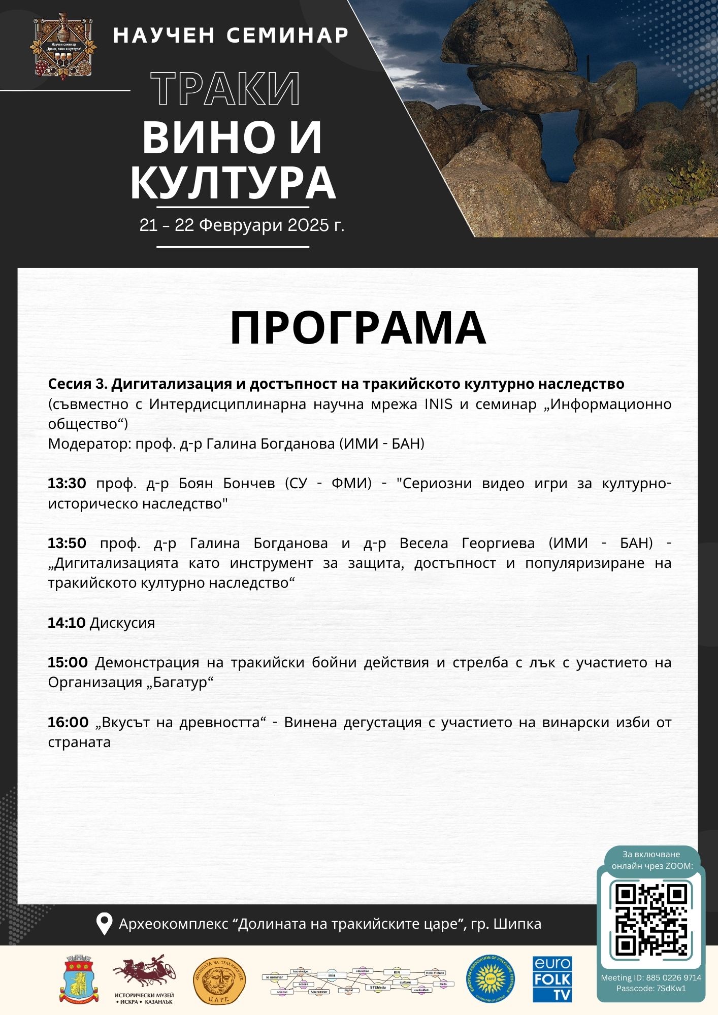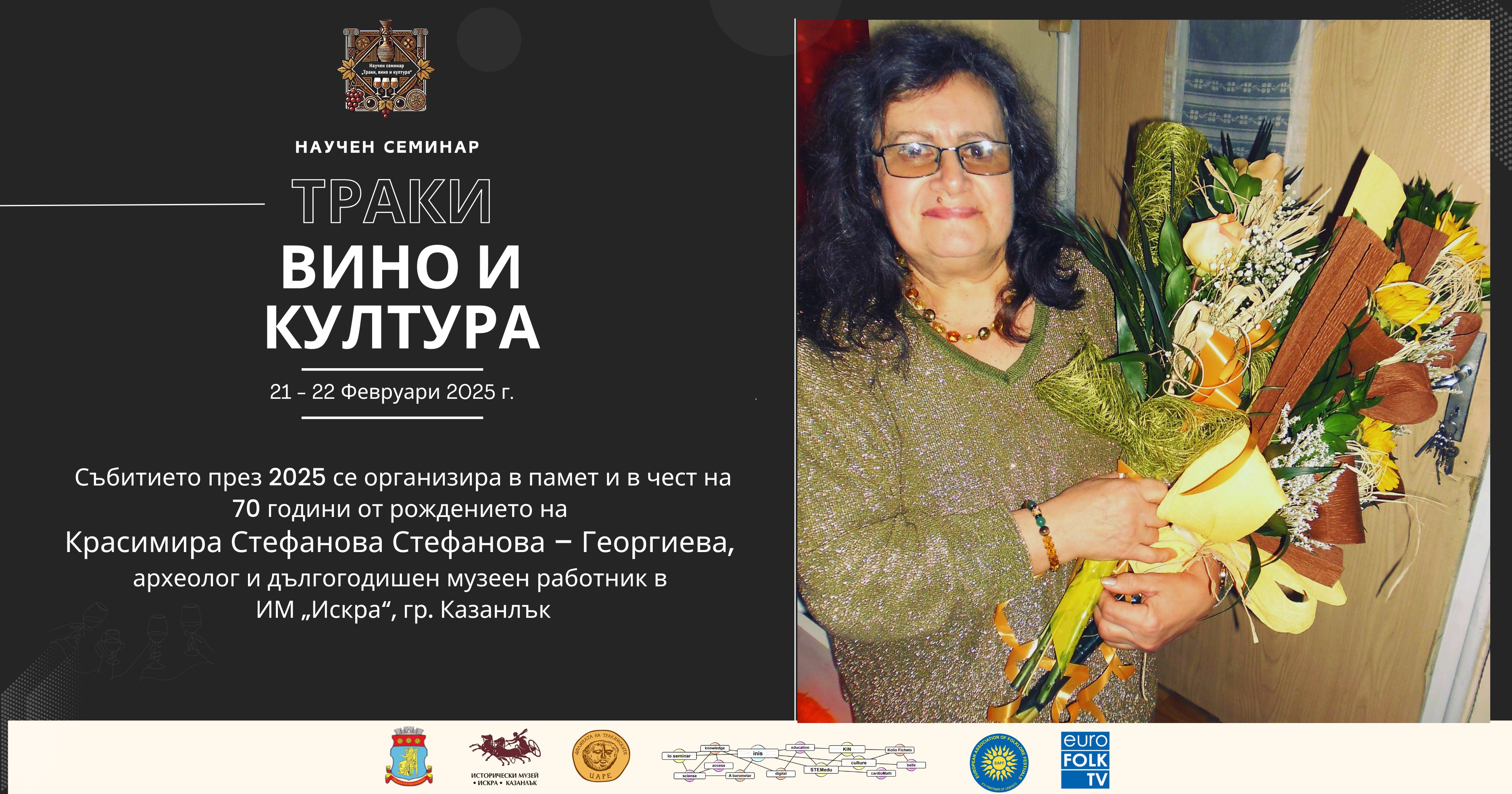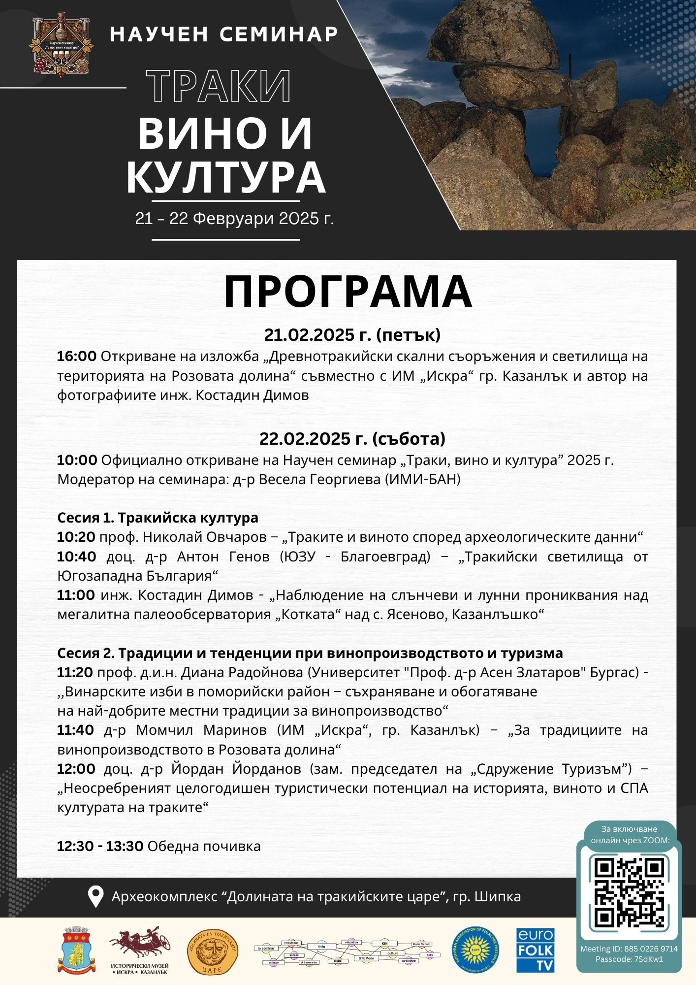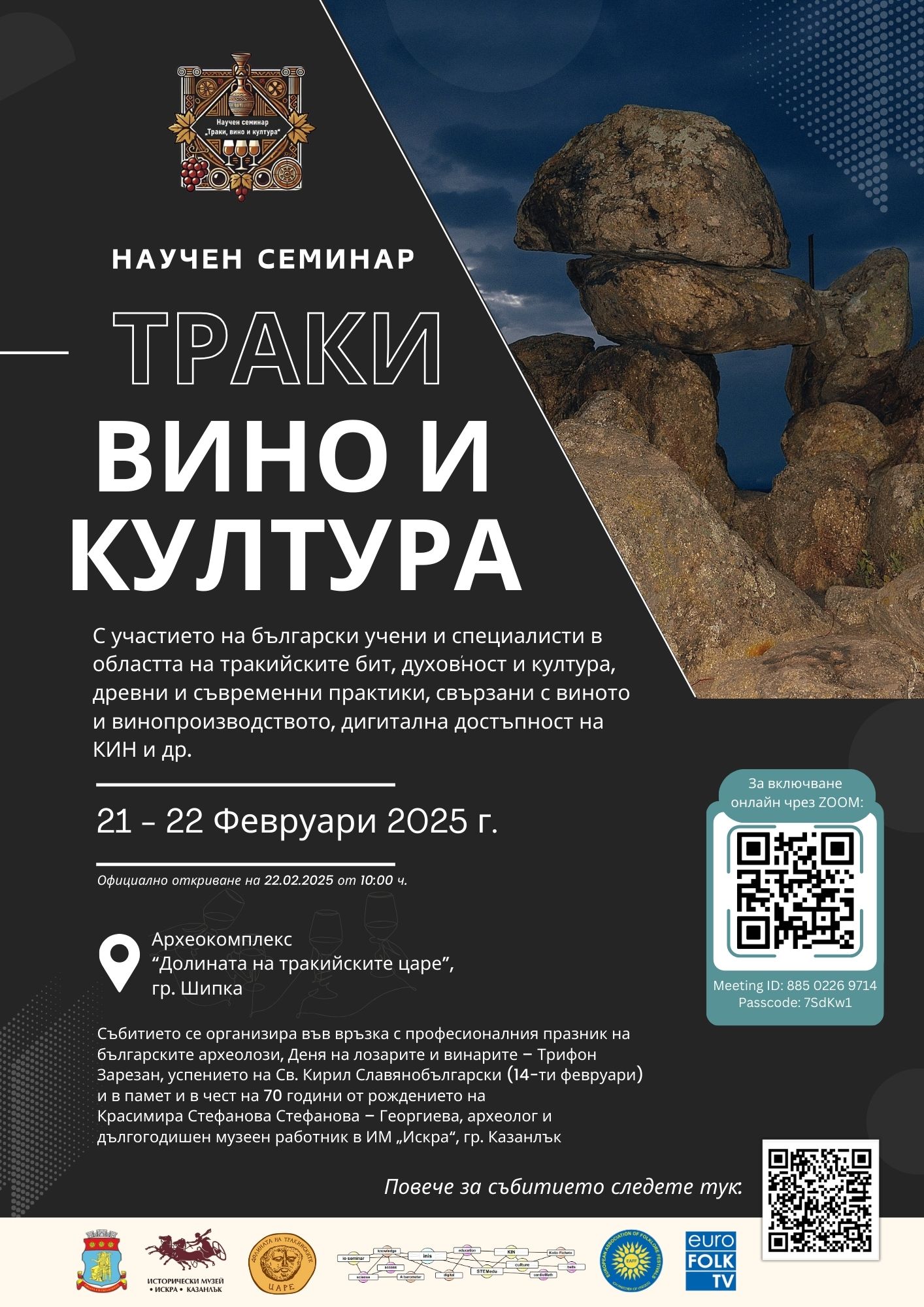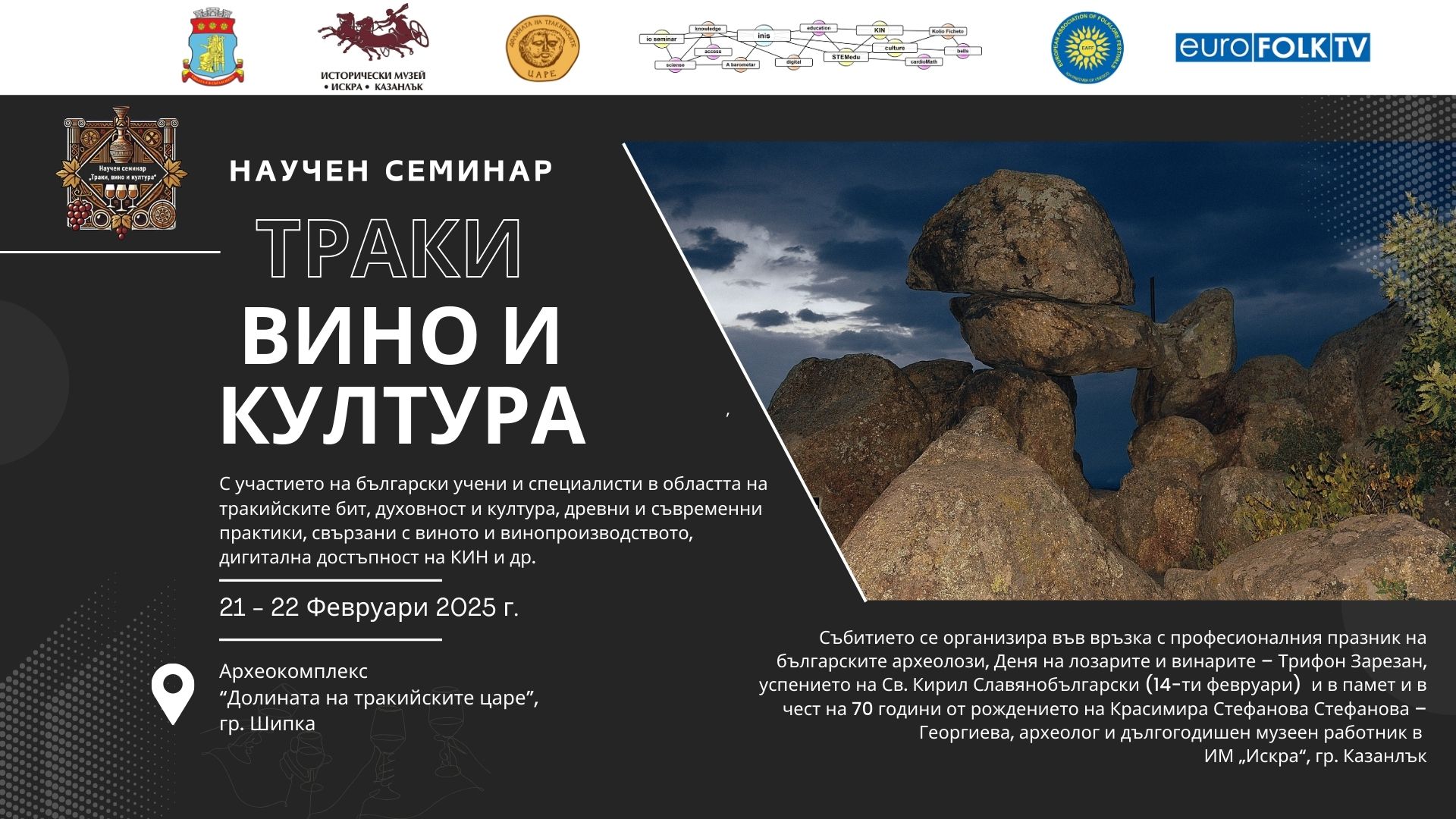 В периода 21 – 22 февруари 2025 г. в Археокомплекс „Долината на тракийските царе“ (гр. Шипка, общ. Казанлък) и онлайн ще се проведе деветото издание на Научен семинар ,,Траки, вино и култура”.