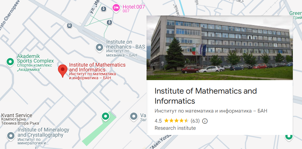 There are other small and cozy hotels in the area of IMI-BAS (campus "4th kilometer"). Participants are not restricted to the proposed hotels.