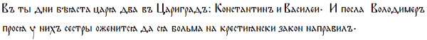 «Въ ты дни беяста царя два въ Цариградъ: Константин и Василей. И посла Володимеръ прося у них сестры оженится да ся больма на крестиянски закон направилъ.» (СРЕ; цит. по ЧИЛ1 с. 15)